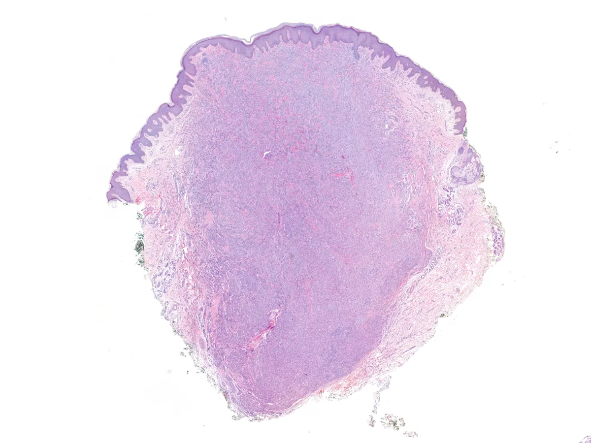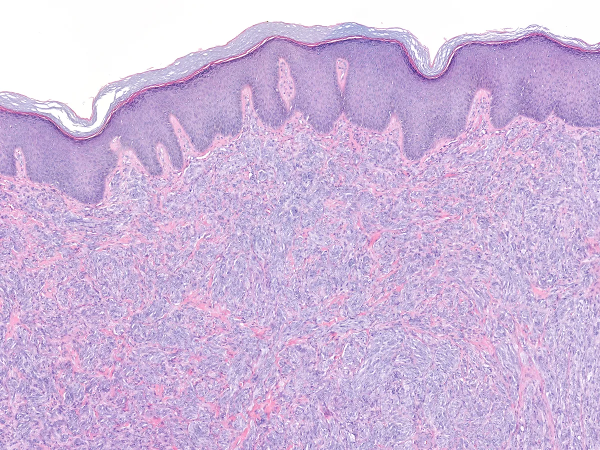 • La morfología es uniforme, con gran semejanza al sarcoma de células claras. Se tratan de tumores nodulares dérmicos bien circunscritos, no encapsulados y sin pigmento. Pueden apoyarse en la epidermis, aunque raramente la afectan. Las células se disponen en nidos y fascículos cortos y largos que se entrecruzan, así como bandas fibrosas delgadas entre estos haces. Las células son fusiformes con un amplio citoplasma de pálido a anfófilo, cromatina vesiculosa y nucleolo prominente. Pueden tener mitosis típicas. PMID: 35993578.