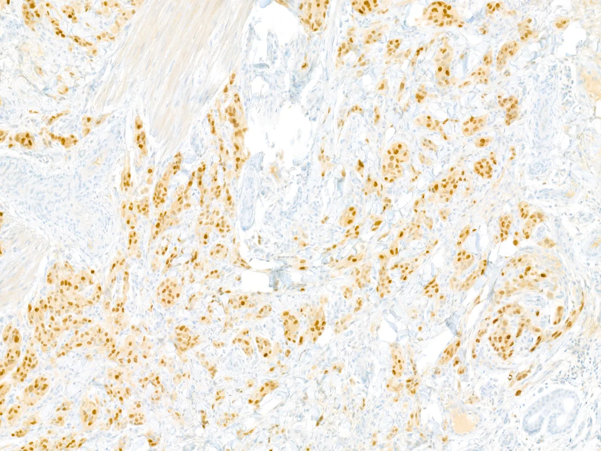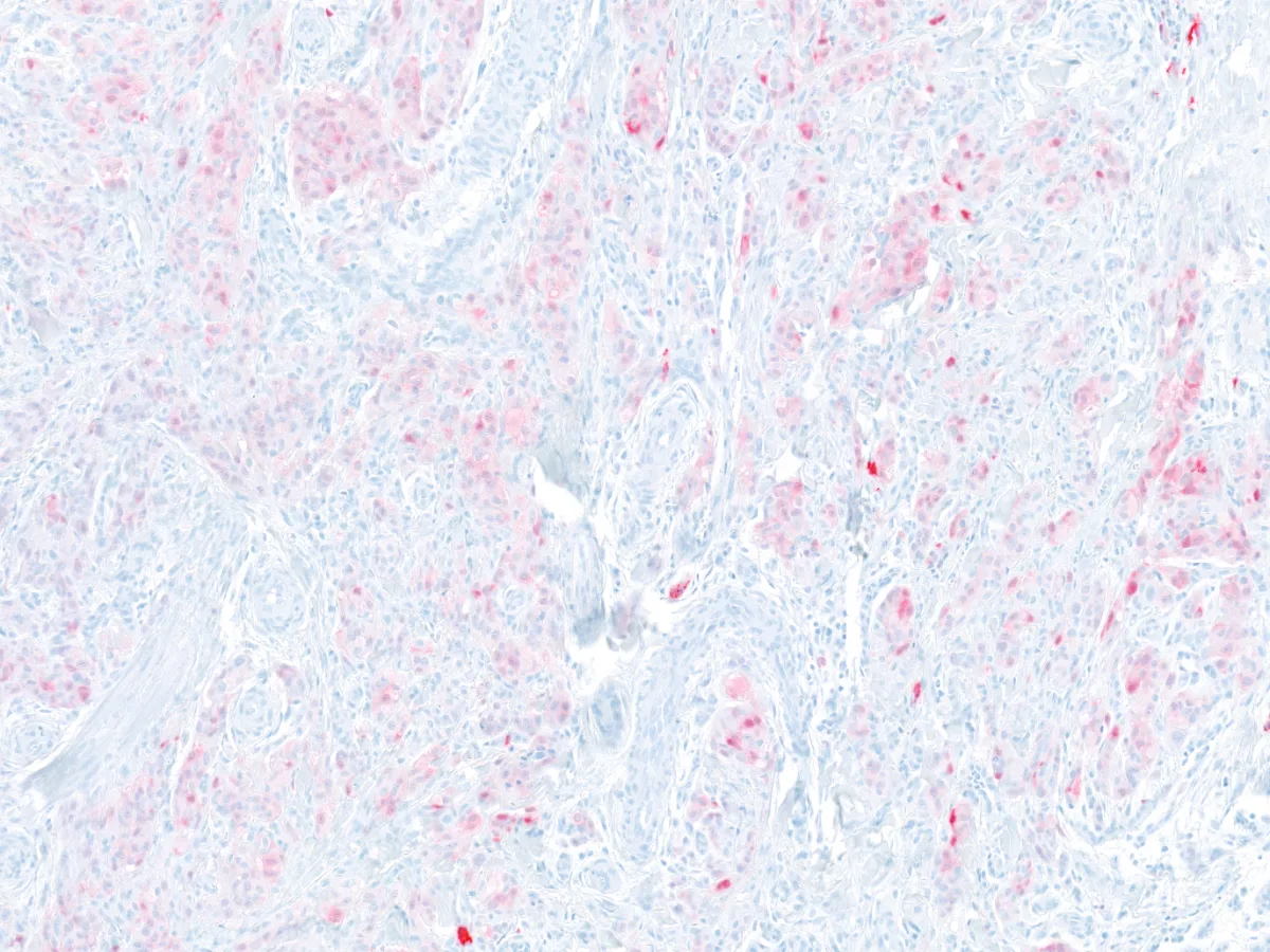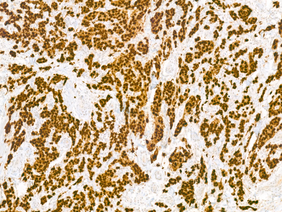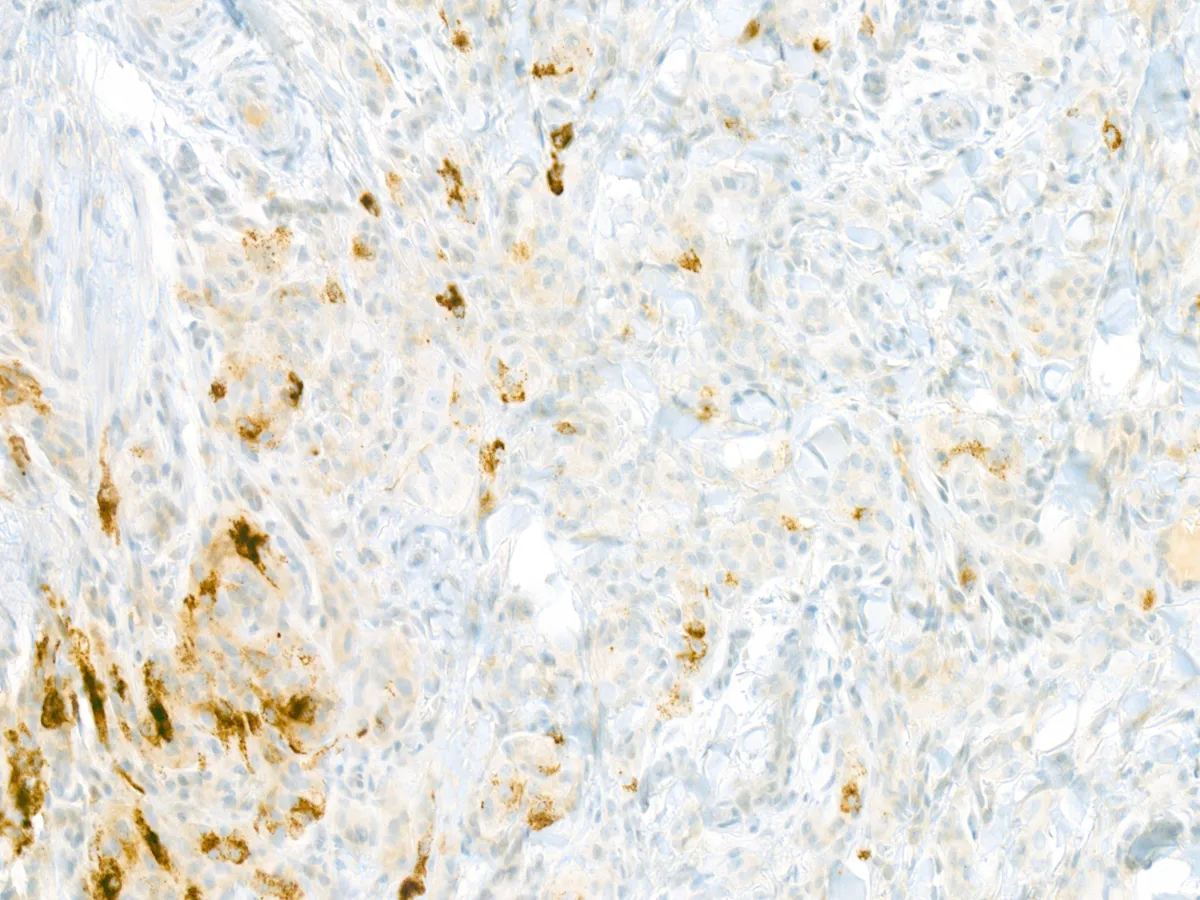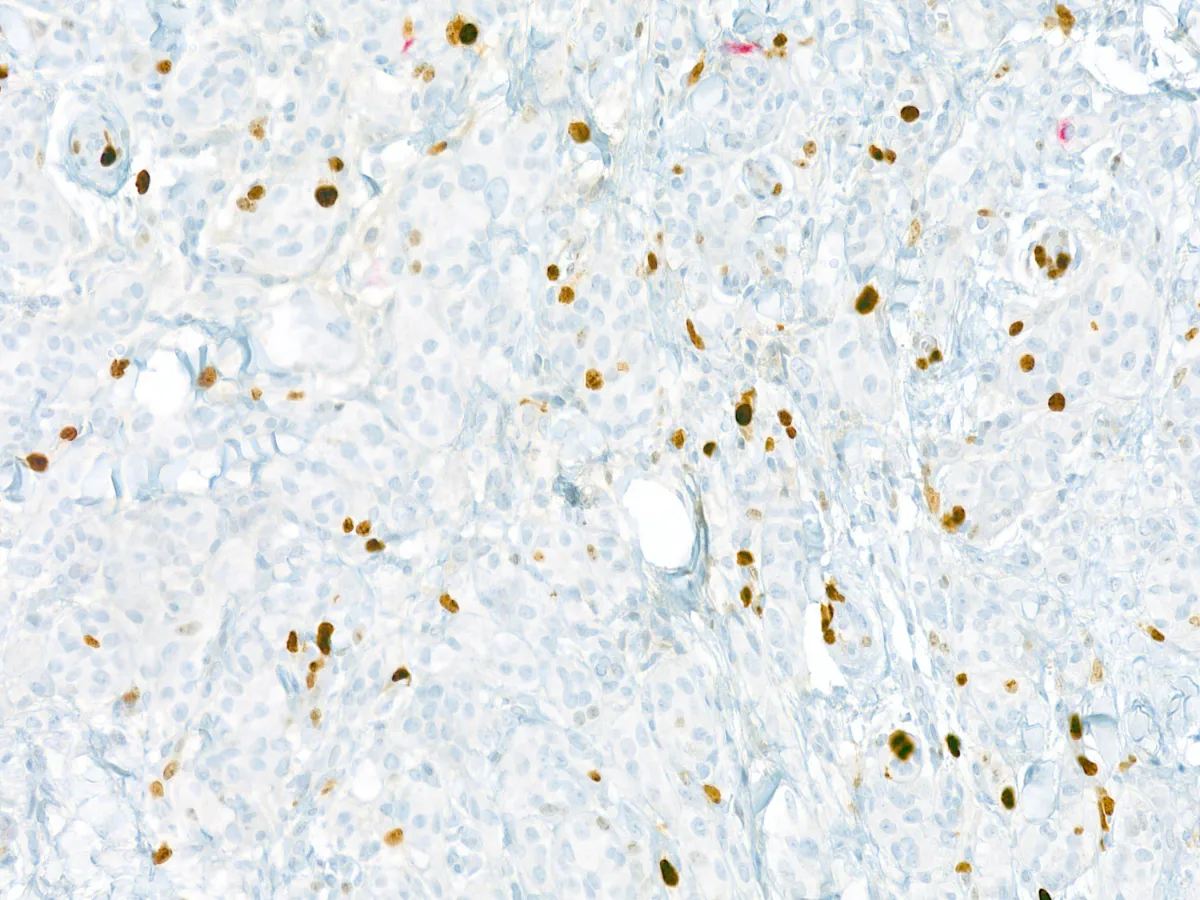 • Todos los tumores expresan SOX10. En un 50% de los casos expresan S100 con patrón difuso. Melan-A/MART-1 y HMB-45 se expresan focalmente. La inmunohistoquímica para TRIM11 es típicamente positiva nuclear en la periferia del tumor. Pueden expresan Pan-TRK (57% citoplasmático difuso, 36% citoplasmático parcheado), a pesar de no tener mutaciones de TRK. PMID: 35993578; PMID: 29240581.