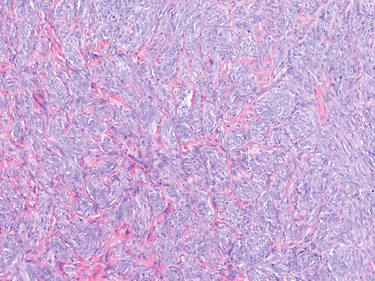 Los cortes histológicos muestran una tumoración dérmica bien delimitada, no encapsulada, que ocupa todo el espesor de la dermis reticular, constituida por células con cierto pleomorfismo, núcleos vesiculosos con nucleolo prominente y citoplasma anfófilo que se agrupan formando pequeños nidos bien delimitados y separados por finos tractos de colágeno. El índice mitótico es elevado (4 mitosis por mm2).