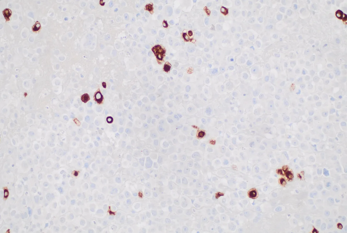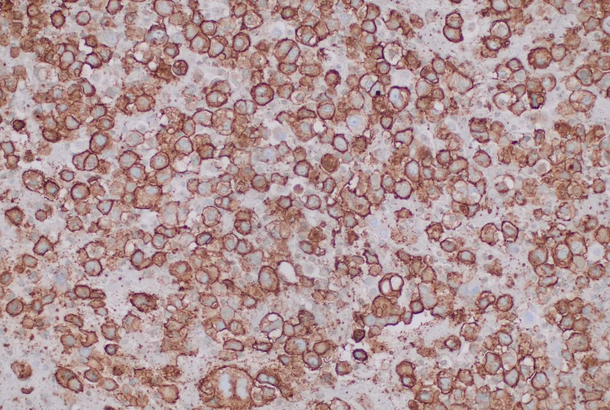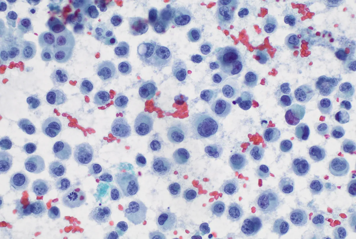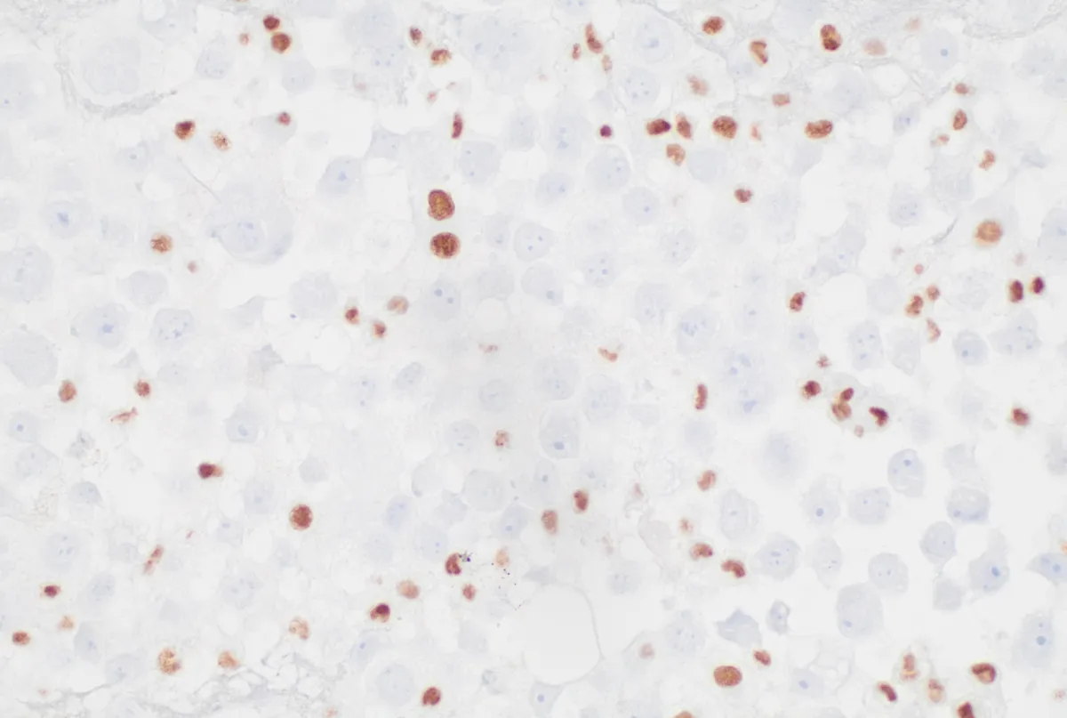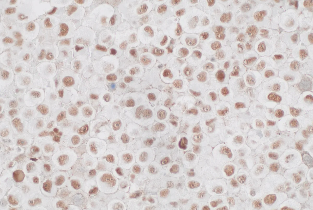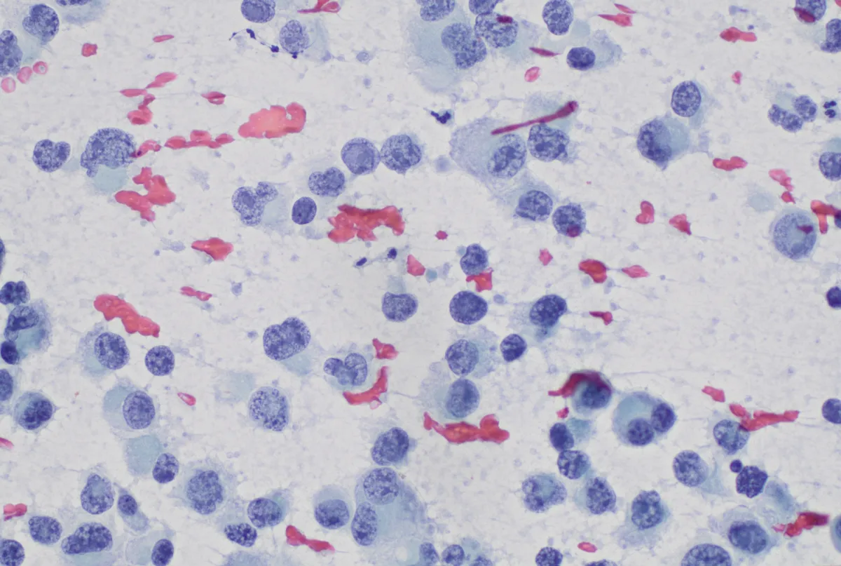 - Lesión sólida de células discohesivas y monomorfas de morfología ovoide, rabdoide o pleomórfica con núcleos de cromatina laxa y nucleolos evidentes. [PMID: 40406754]