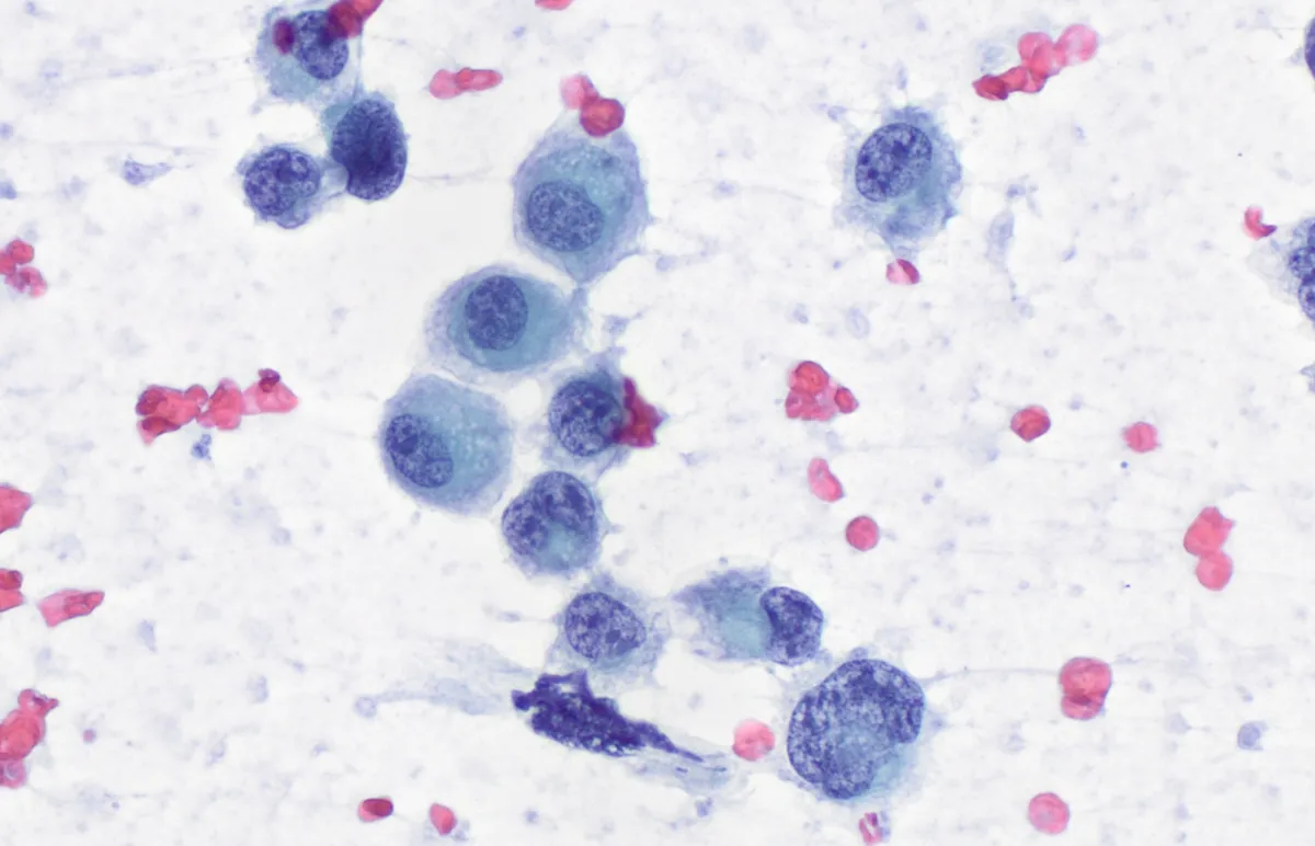 Varón de 67 años, exfumador, que presenta disnea y astenia, por lo que se realiza una tomografía computerizada (TC). Se detecta una masa pulmonar subpleural de 23 mm, hipermetabólica en el PET, acompañada de derrame pleural y lesiones sugestivas de metástasis ganglionares y a distancia. Se realiza una citología del líquido pleural en la que se observa unas extensiones hipercelulares de células sueltas pleomórficas de morfología rabdoide, con núcleo excéntrico y nucleolos marcados. Las técnicas inmunocitoquímicas (ICQ) que resultaron positivas son el CD34 y EMA, de forma aislada, con negatividad para marcadores epiteliales, neuroendocrinos y melanocíticos, entre otros. Se demostró pérdida de expresión nuclear de SMARCA4 (BRG1) y SMARCA2 (BRM), con retención nuclear de SMARCB1 (INI1). Se confirmó la deleción de SMARCA4 por secuenciación masiva. Aunque la biopsia es considerada el gold-standard para el diagnóstico de esta entidad, la citología resultó ser válida en este caso.