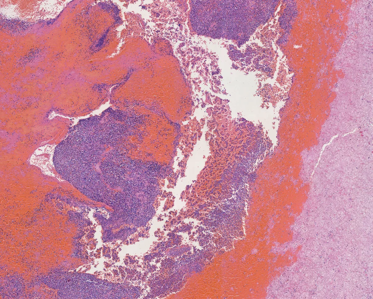 Varón de 70 años que acude a urgencias por empeoramiento en los últimos 3 días asociado a desorientación, dificultad para hablar y pérdida de fuerza de hemicuerpo derecho. Se realiza TAC cerebral que destaca colección extraaxial parietal posterior izquierda, con espesor de hasta 37 mm, y asociado un pequeño foco hemorrágico intraparenquimatoso de 6 mm en parénquima parietooccipital adyacente con leve edema perilesional asociado. Se decide intervención quirúrgica urgente en la que se identifica importante colección subdural asociada a LOE (lesión ocupante de espacio) extraaxial compatible con posible meningioma con hematoma organizado alrededor de la lesión. Se diseca la lesión y se envía a Anatomía Patológica.