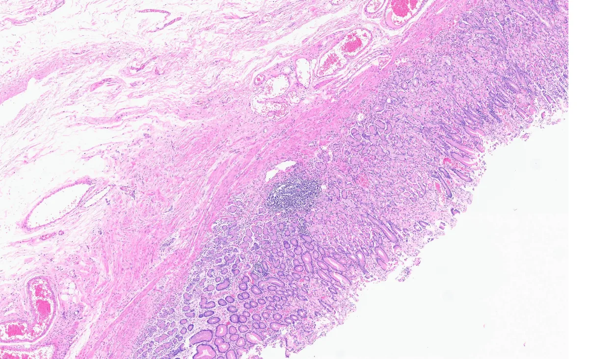 Paciente mujer de 45 años evaluada en la Unidad de Consejo Genético debido a una historia familiar de cáncer gástrico (madre a los 44 años y hermana a los 34 años, ambas fallecidas), sin otros antecedentes de interés. El estudio genético revela la presencia de una variante de significado incierto en el gen CDH1 (c.1808G>A; p.Cys603Tyr). Gastroscopia realizada bajo el Protocolo de Cambridge, que muestra infiltración por carcinoma difuso de células en anillo de sello en una de las biopsias del antro gástrico. No se observan signos de metástasis en estudios de imagen. Tras discusión en comité multidisciplinario, se decide realizar gastrectomía total y linfadenectomía laparoscópica. En la pieza quirúrgica se confirma carcinoma de células en anillo de sello en región antral.