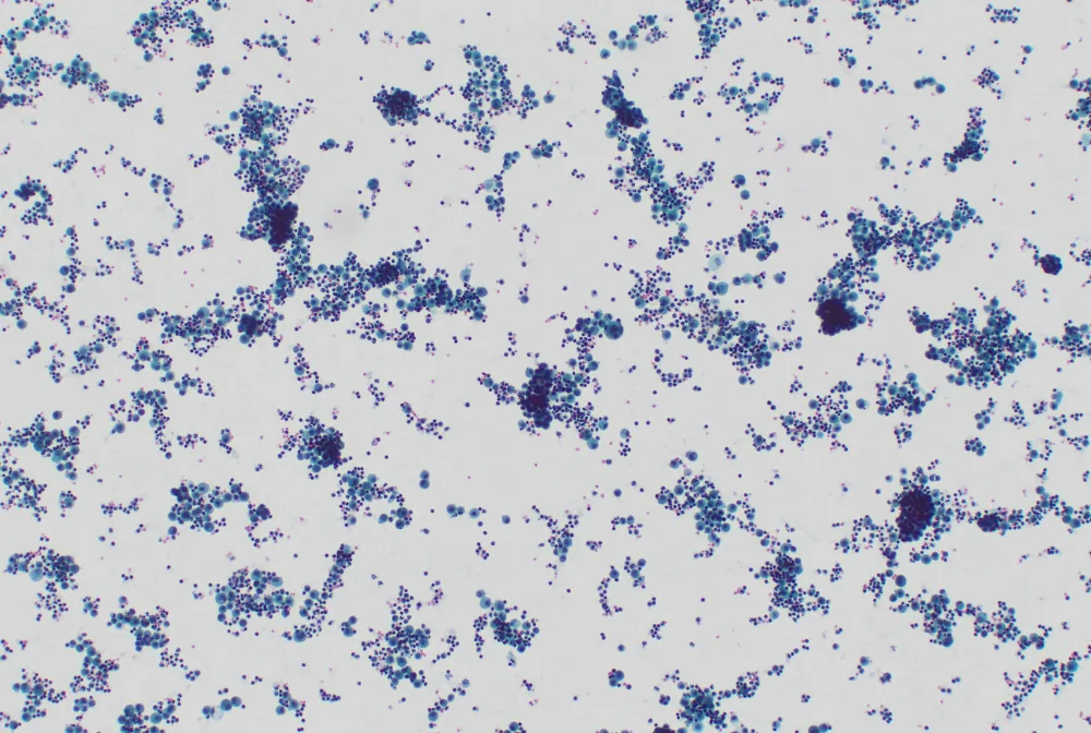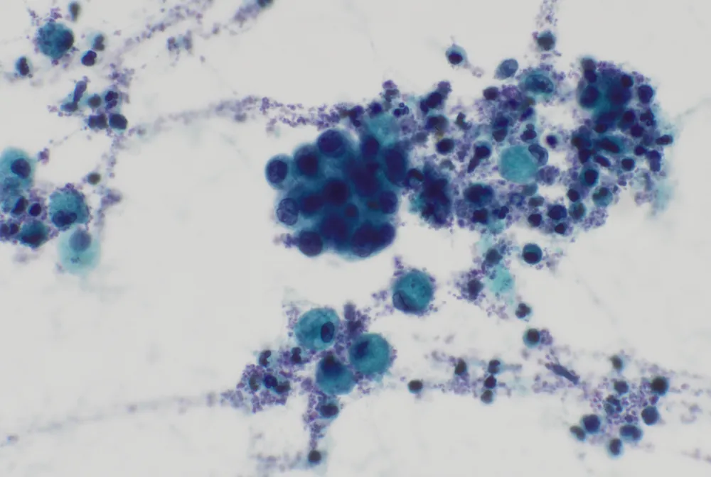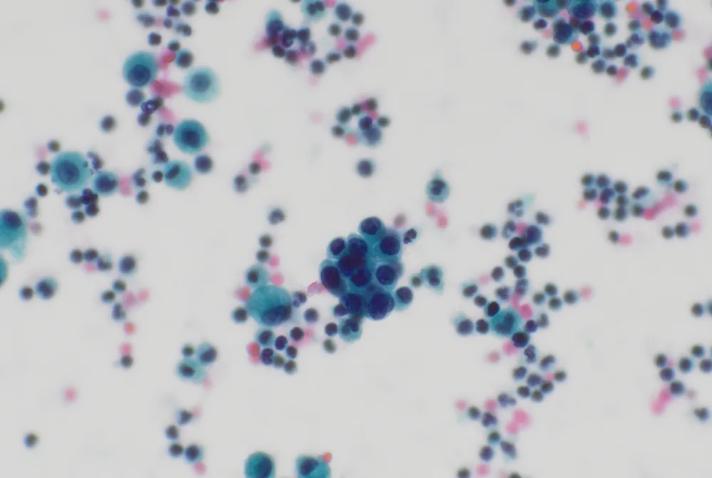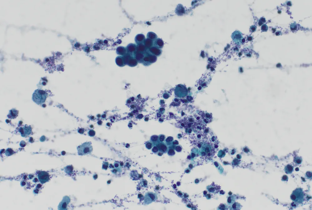 - Las citologías muestran un fondo inflamatorio mixto asociado con macrófagos y grupos redondeados cohesivos de células que presentan núcleos generalmente monótonos con alguna pequeña irregularidad en la membrana nuclear y alteración en la relación núcleo-citoplasma. Ante esta atipia citológica leve se plantea el diagnóstico diferencial entre reactividad y malignidad, pero se sugiere un diagnóstico de sospechoso de malignidad por la cantidad elevada de grupos.