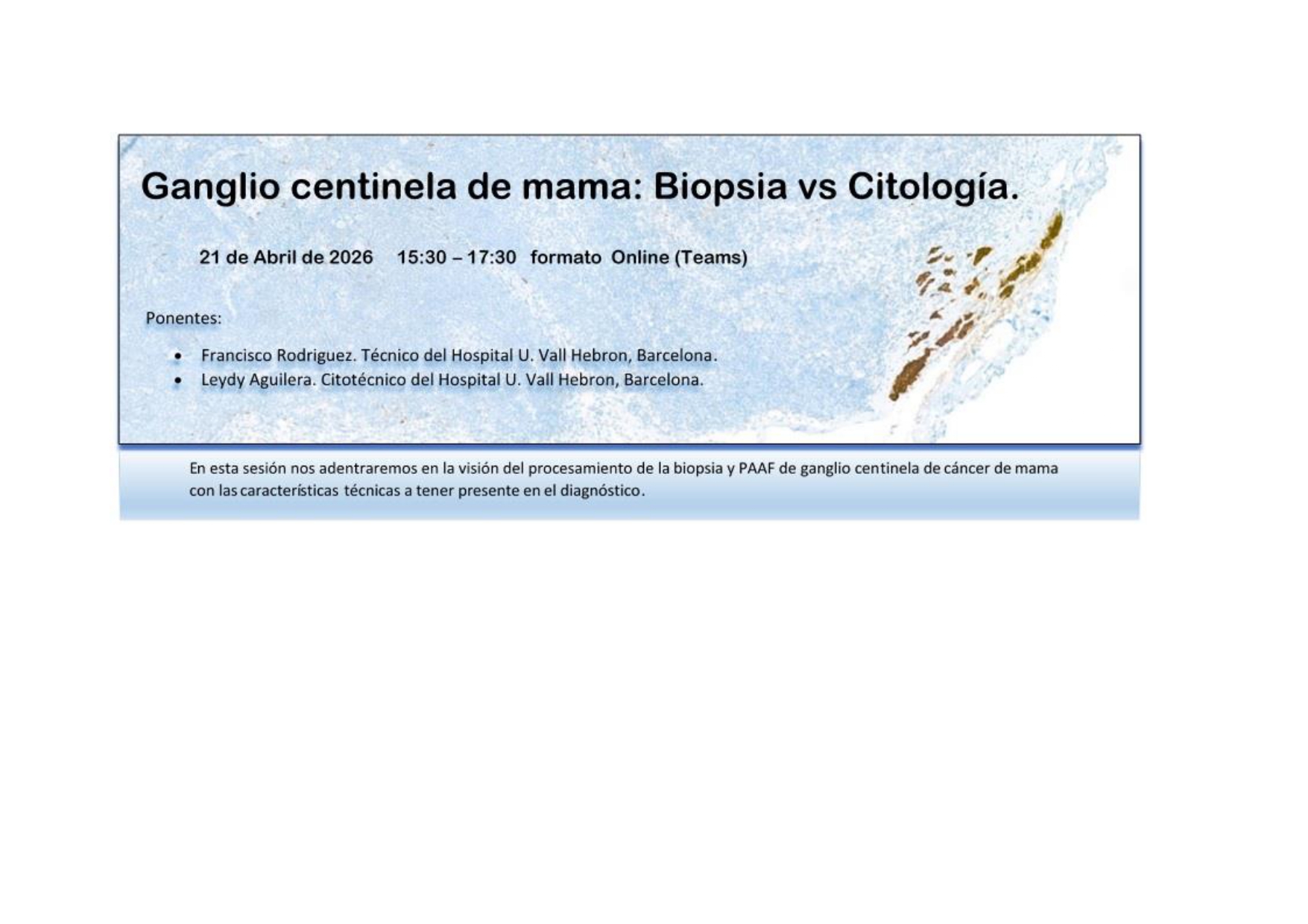 Sesión de: «Ganglio centinela de mama: Biopsia vs Citología.» para el 21 de abril de 2026 a las 15:30- 17:30, que tendrá lugar en formato Online (Teams)
